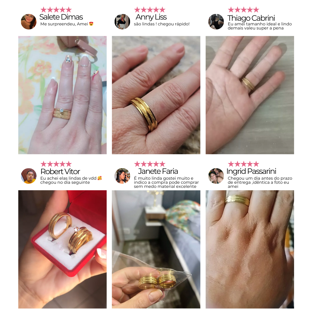 - **Incluso:** Par de alianças (2 unidades) + Anel Solitário + Saquinho veludo para armazenamento